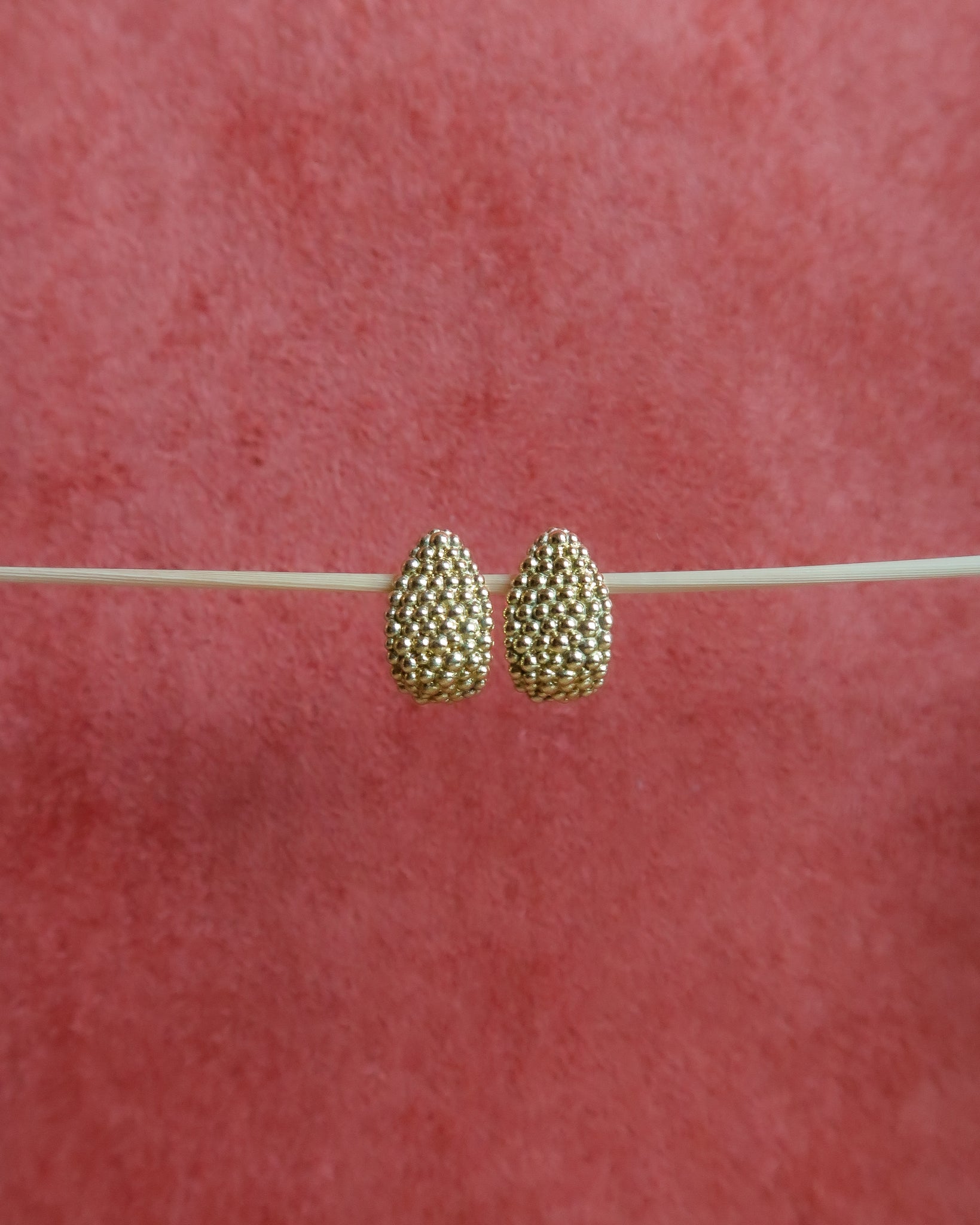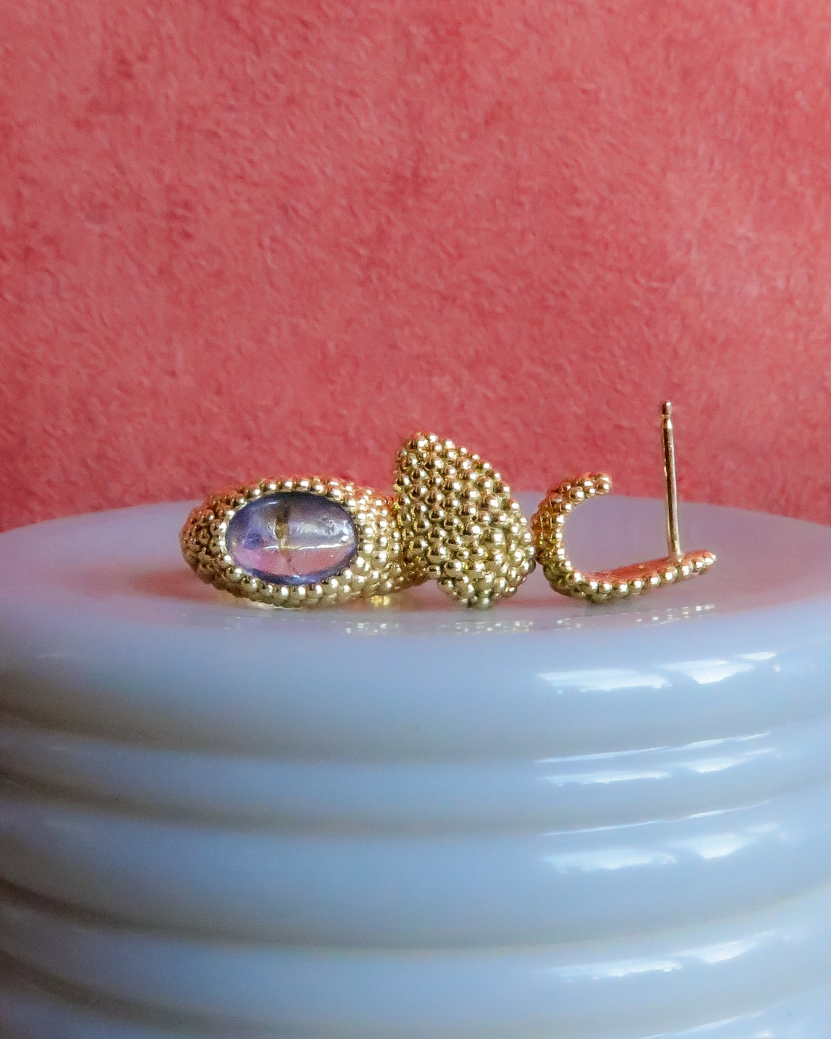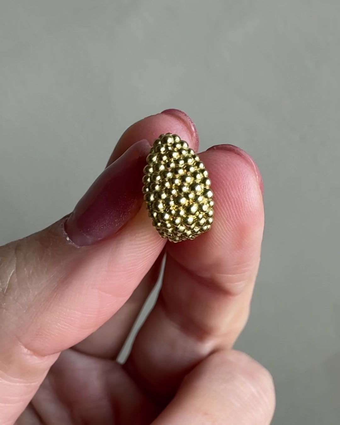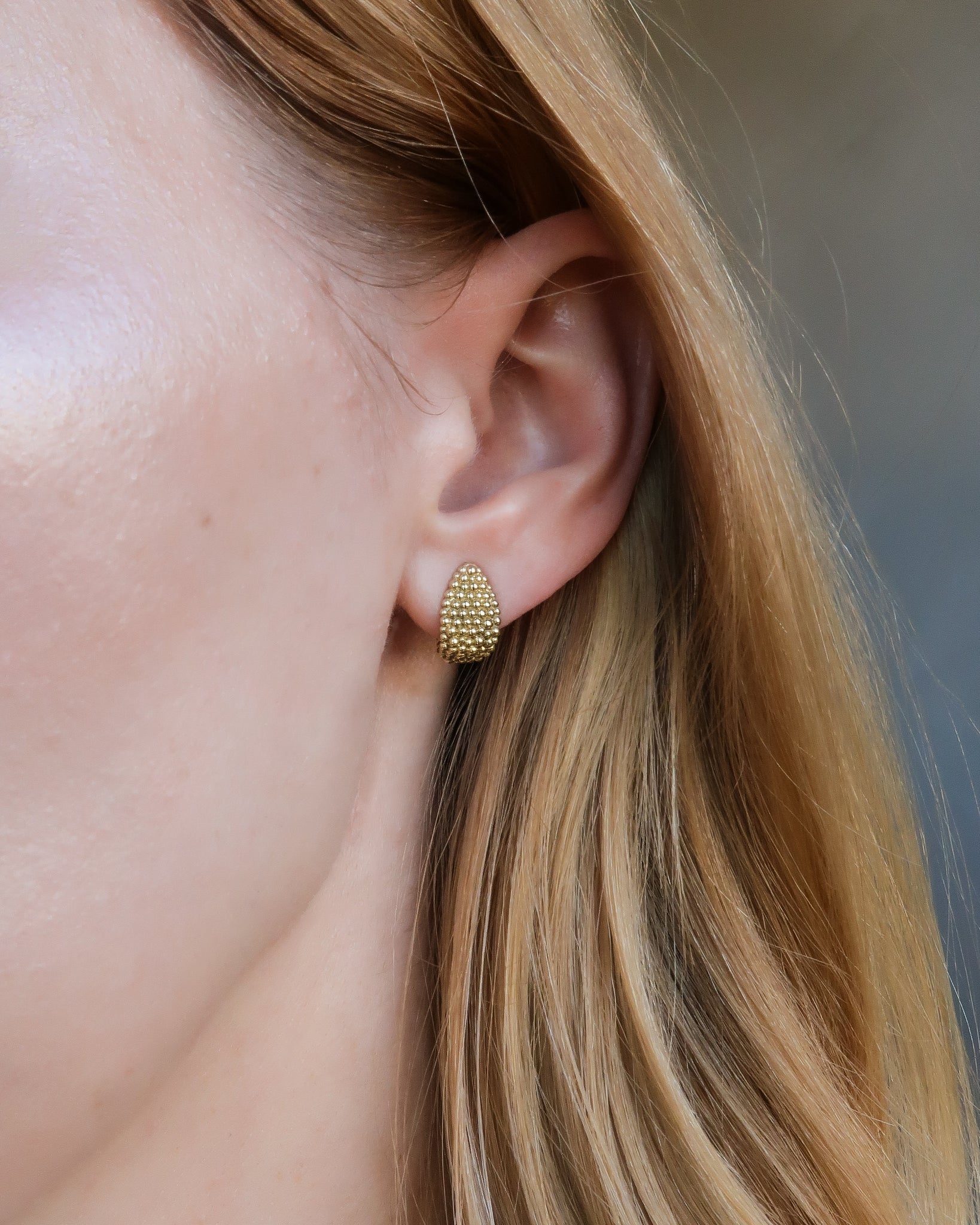 The Mycenaean Huggies are largely inspired by Cypriot gold jewelry from the Late Bronze Age. The pebbled texture was a popular motif among Cyprian jewelers, created by using gold granules to form designs and add texture to pieces. The Mycenaean Collection marks a new direction for Psyche, in which pieces are more directly representative of ancient designs.