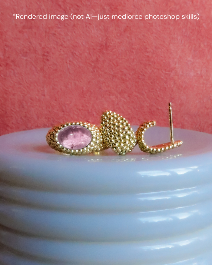 The Mycenaean Pebble Signet is largely inspired by Cypriot gold jewelry from the Late Bronze Age. The pebbled texture was a popular motif among Cyprian jewelers, created by using gold granules to form designs and add texture to pieces. The Mycenaean Collection marks a new direction for Psyche, in which pieces are more directly representative of ancient designs.