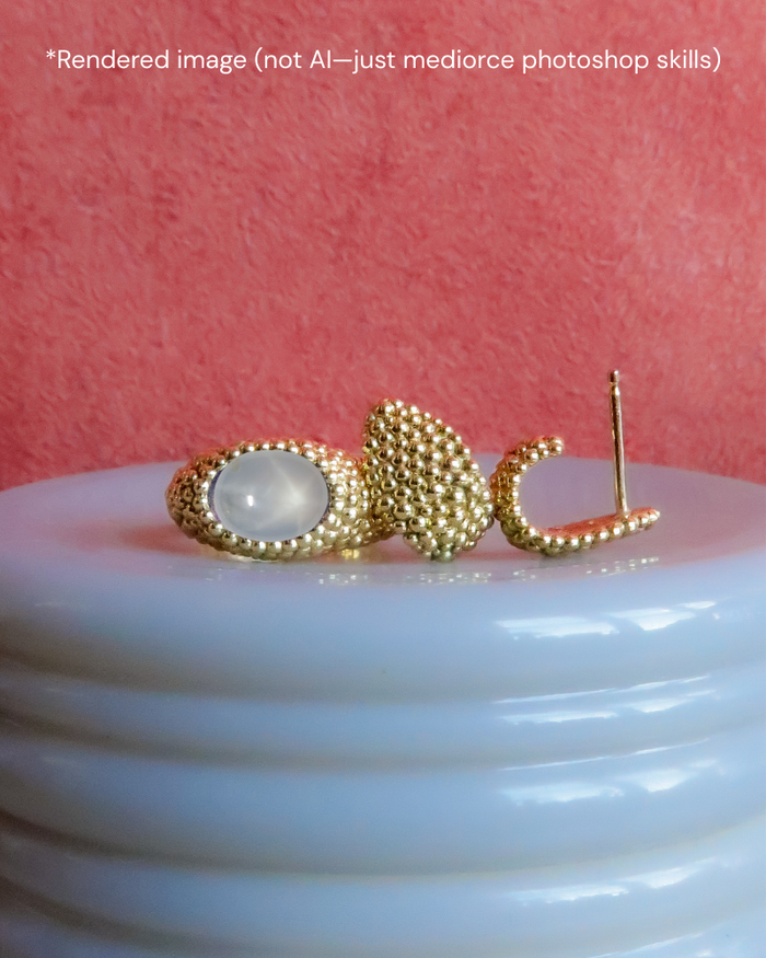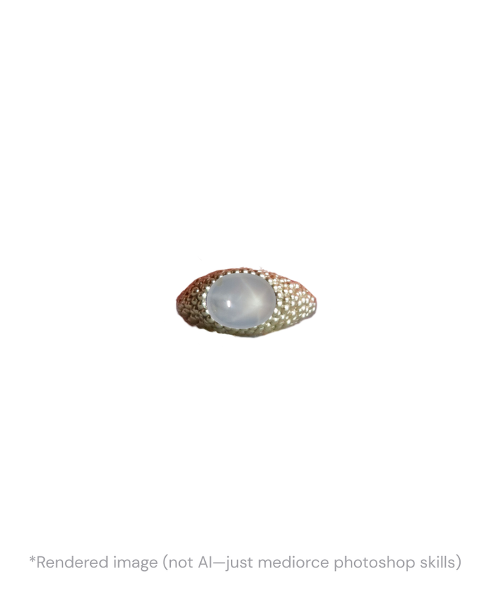 The Mycenaean Pebble Signet is largely inspired by Cypriot gold jewelry from the Late Bronze Age. The pebbled texture was a popular motif among Cyprian jewelers, created by using gold granules to form designs and add texture to pieces. The Mycenaean Collection marks a new direction for Psyche, in which pieces are more directly representative of ancient designs.